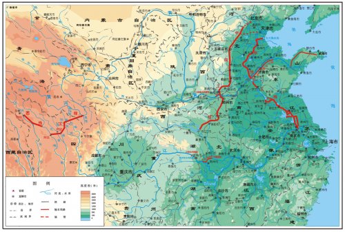 2.中線工程:從加壩擴(kuò)容后的丹江口水庫陶岔渠首閘引水,沿線開挖渠道,經(jīng)唐白河流域西部過長江流域與淮河流域的分水嶺方城埡口,沿黃淮海平原西部邊緣,在鄭州以西李村附近穿過黃河,沿京廣鐵路西側(cè)北上,可基本自流到北京、天津。輸水干線全長1431.945千米(其中,總干渠1276.414千米,天津輸水干線155.531千米)。規(guī)劃分兩期實(shí)施。